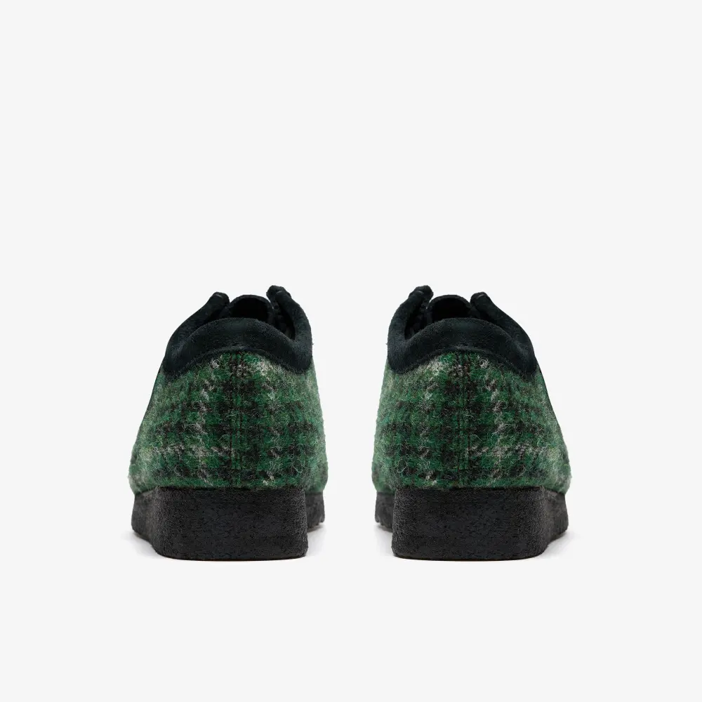 This unique version of the classic Wallabee™ features striking green Harris Tweed on the quarter panels, paired with suede on the vamp, collar, and apron binding, offering a tactile contrast of textures.