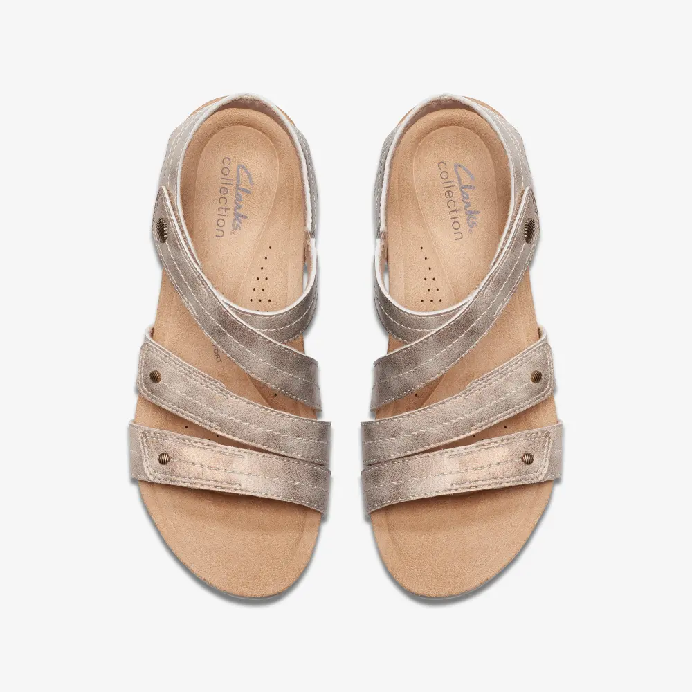 Subtle studs and strappy sophistication blend with gladiator-inspired style on sporty wedge heels in the Calenne Clara sandals from Clarks.
